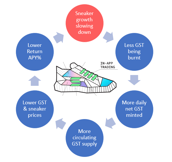 The problem with STEPN is that there is no real deflationary component. The only sustainable way to remove GST from the economy is to burn it when repairing your shoes, leveling them up, upgrading gems, etc. Burning GST appears to be deflationary, but in reality, the action is net inflationary.