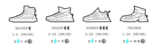 STEPN has a dual-token system with GST and GMT representing the utility and governance tokens respectively. GST is the token most people earn by simply moving, while GMT cannot be earned until the sneaker you’re using reaches Level 30, which can take months. An easy way to think of this is GST is like being paid a wage, while GMT is like being paid in equity.